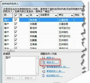 3. 在随即进入的“邮件合并收件人”对话框中,可以看到从Outlook中导入进来的所有客户信息。不过,小黄只想给“经理”和“总经理”级别的客户发送邀请函,所以他需要在“调整收件人列表”选项区域中,单击的“筛选”文本链接,以筛选符合条件的客户,如图3所示。