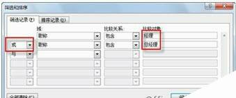 4. 在随即打开的“筛选和排序”对话框中,将“域”设置为“职称”,“比较关系”设置为“包含”,“比较对象”设置为“经理”,或者“总经理”,如图4所示。