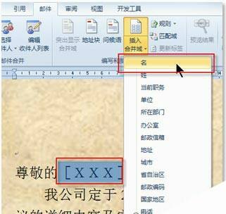 1. 首先,将光标定位到需要显示客户姓名的位置上,然后在“邮件”选项卡的“编写和插入域”选项组中,单击“插入合并域”下三角按钮,在随即打开的下拉列表中单击“名”选项,如图6所示。