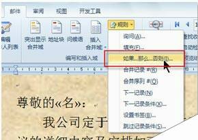 1. 光标定位在已插入的“名”域的后面,然后在“编写和插入域”选项组中,单击“规则”下三角按钮,在随即打开的下拉列表中执行【如果…那么…否则…】命令,如图8所示。