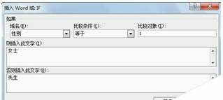2. 在随即打开的“插入Word域:IF”对话框中,将“域名”设置为“性别”域,,“比较条件”设置为“等于”,“比较对象”设置为“1”(从Outlook导入联系人时,系统自动将“性别”字段转换为了“布尔值”,即“1”代表“女”,“2”代表“男”),并在“则插入此文字”列表框中输入“女士”,在“否则插入此文字”列表框中输入“先生”,如图9所示。