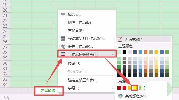 1、在工作标签【产品价格】上单击鼠标右键,从弹出的快捷菜单中选择【工作表标签颜色】菜单项。在弹出的级联菜单中列出了各种标准颜色,从中选择自己喜欢的颜色即可,例如选择【黄色】选项。