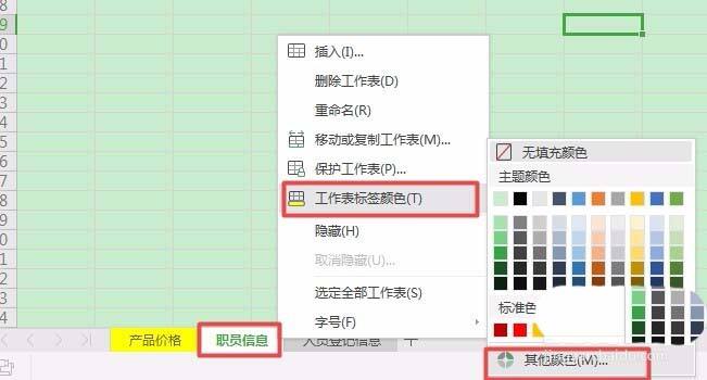 3、如果用户对【工作表标签颜色】级联菜单中的颜色不满意,还可以进行自定义操作。对工作标签【职员信息】进行自定义操作,从【工作表标签颜色】级联菜单中选择【其他颜色】菜单项。