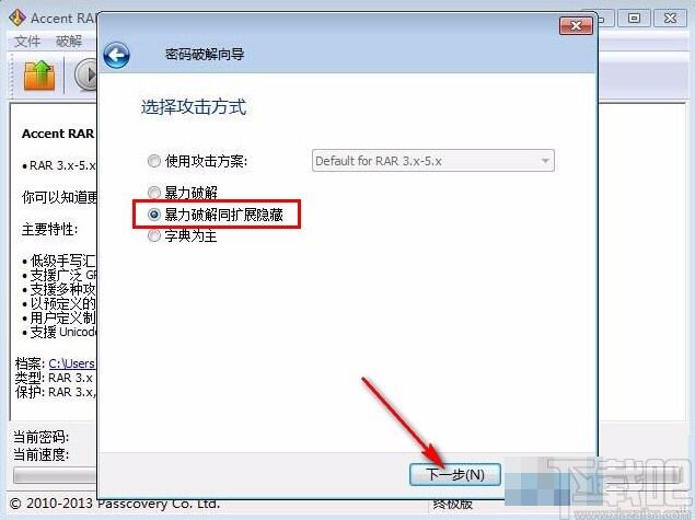 4.点击下一步之后就是需要我们选择预设的攻击方式,主要是暴力破解、字典为主等方式,我们选中“暴力破解同扩展隐藏”这个选项之后点击下一步。