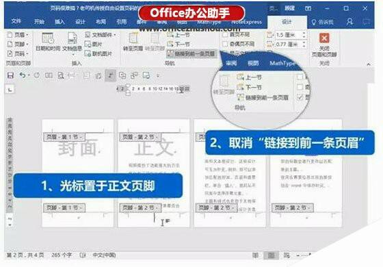 第二步:取消【链接到前一条页眉】设置,以便对每节进行单独编写