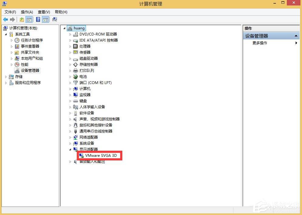 3、接下来在计算机管理界面的左窗格选择“设备管理器”选项,如图所示: