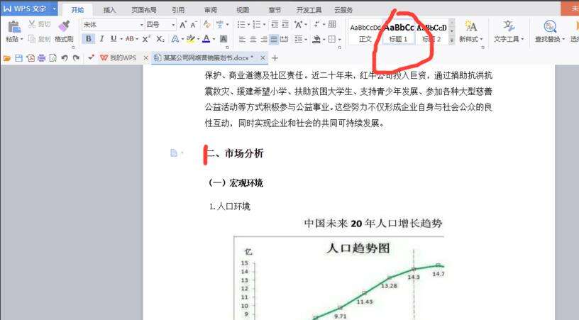 3、接下来我们将各个标题套用样式。具体操作就是将光标放在标题前,点击上面的“标题1”“标题2”,根据自己的需要确定有几个标题。然后,一定要把每个标题都套用格式,不然目录。
