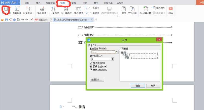 5、最后我们点击引用栏下的目录,在插入目录中的“目录选项”中设置制表符以及显示级别(就是前面你设置了几级目录),然后点击确定目录就可以生成了。