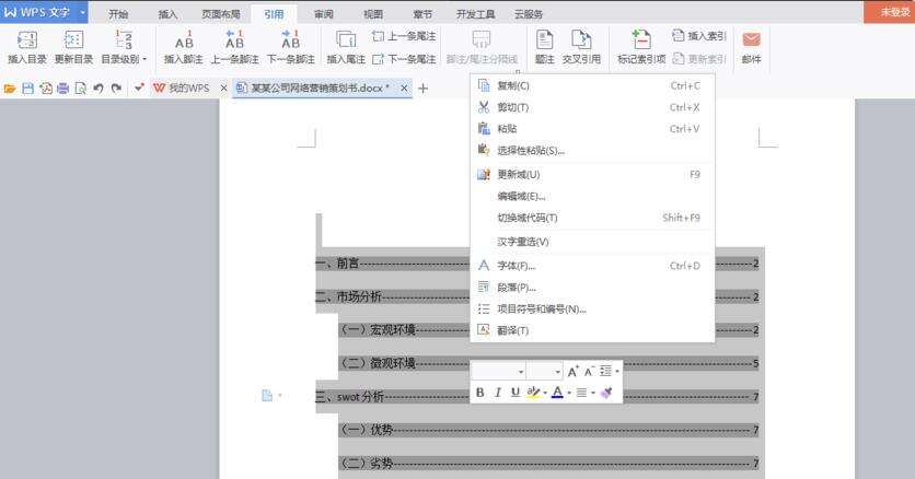 6、生成目录后我们还可以为目录的格式进行设置。只需要选中已生成的目录然后右键单击,在弹出的对话框中设置就可以了。
