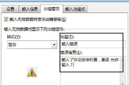 打开“出错警告”选项卡,在“样式”下拉列表中选择“警告”选项,设置警告的“标题”和“错误信息”,完成设置后单击“确定”按钮关闭对话框,如图所示。