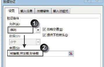 启动excel并打开工作表,在工作表中选择需要设置数据验证的单元格,打开“数据验证”对话框,在“设置”选项卡的“允许”下拉列表中选择“序列”选项,在“来源”文本框中直接输入允许输入的数据序列,如图所示。