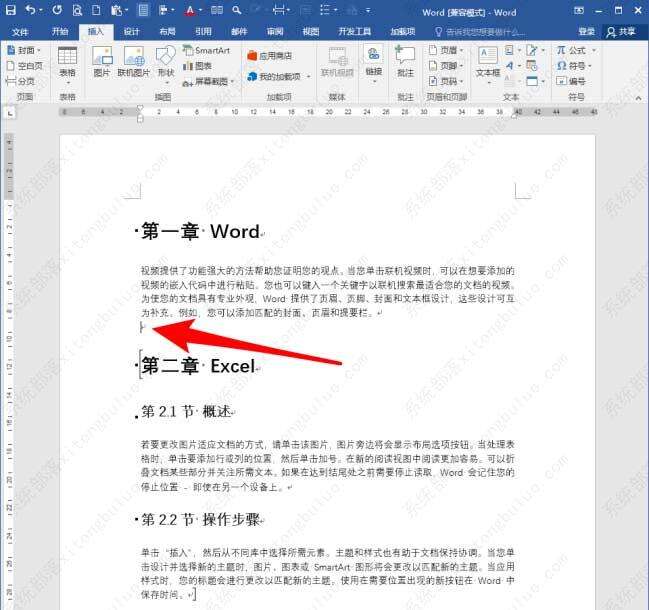 章目录一般位于本章正文的前方,所以,在章标题前方按回车键,插入一个空段落。