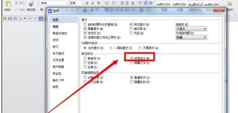 5.点击了“选项”之后,在弹出来的“选项”面板上,在中间的“格式标记”一栏里可以看到有一个段落标记,默认的是打勾的。