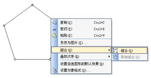 第四步,将这正5边形“组合”成一个整体。依次选中这5条边,再右击,在弹出的快捷菜单中单击“组合”子菜单中的“组合”,就将这个5边形组合成整体了。