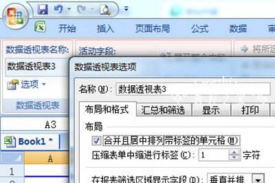 接着点击左上角的数据透视表选项,在弹出来的菜单中勾选【合并且居中排列带标签的单元格】。