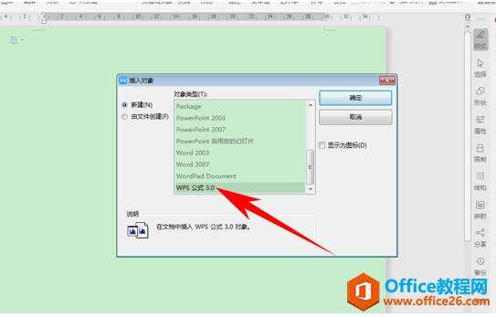 弹出插入对象的对话框,在对象类型当中选择WPS公式3.0,单击确定。