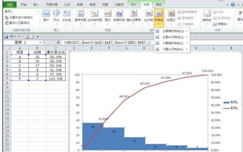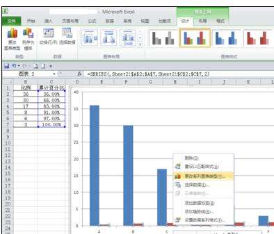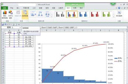 点击图表工具下的设计—选择数据,选中“系列1”,点击编辑按钮,在系列名称下的文本框中输入“比例”,同样地将“系列2”改为“累计百分比”,按确定,可见图例名称已改变。