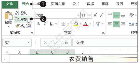 2、复制选中区域。❶切换至“开始”选项卡,❷单击“剪贴板”组中的“复制”按钮,如图所示。