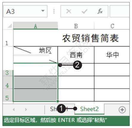 3、指定要粘贴到的单元格区域。❶切换至“Sheet2”工作表,❷选择单元格区域A3:A5,如图所示。