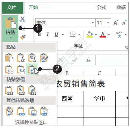4、选择转置粘贴。❶单击“开始”选项卡下“剪贴板”组中的“粘贴”下三角按钮,❷在展开的下拉列表中单击“转置”选项,如图所示。