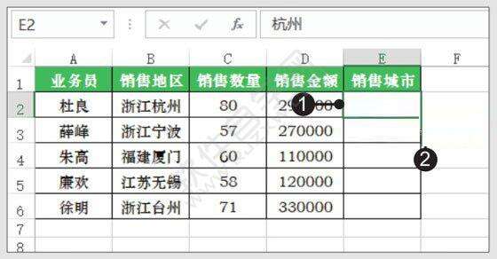(1)在单元格E2中输入文本。打开原始文件,❶在单元格E2中输入文本“杭州”,❷然后将鼠标指针移至单元格E2的右下角,如图所示。