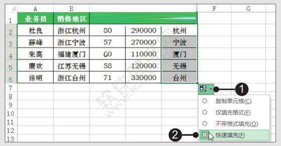 (2)实现快速填充。按住鼠标左键不放,向下拖动至单元格E6处释放鼠标,❶单击“自动填充选项”按钮,❷在展开的列表中单击“快速填充”单选按钮即可实现快速填充,如图所示。