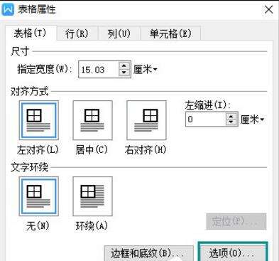 2、点击表格属性选项,在弹出的对话框内找到选项选项。