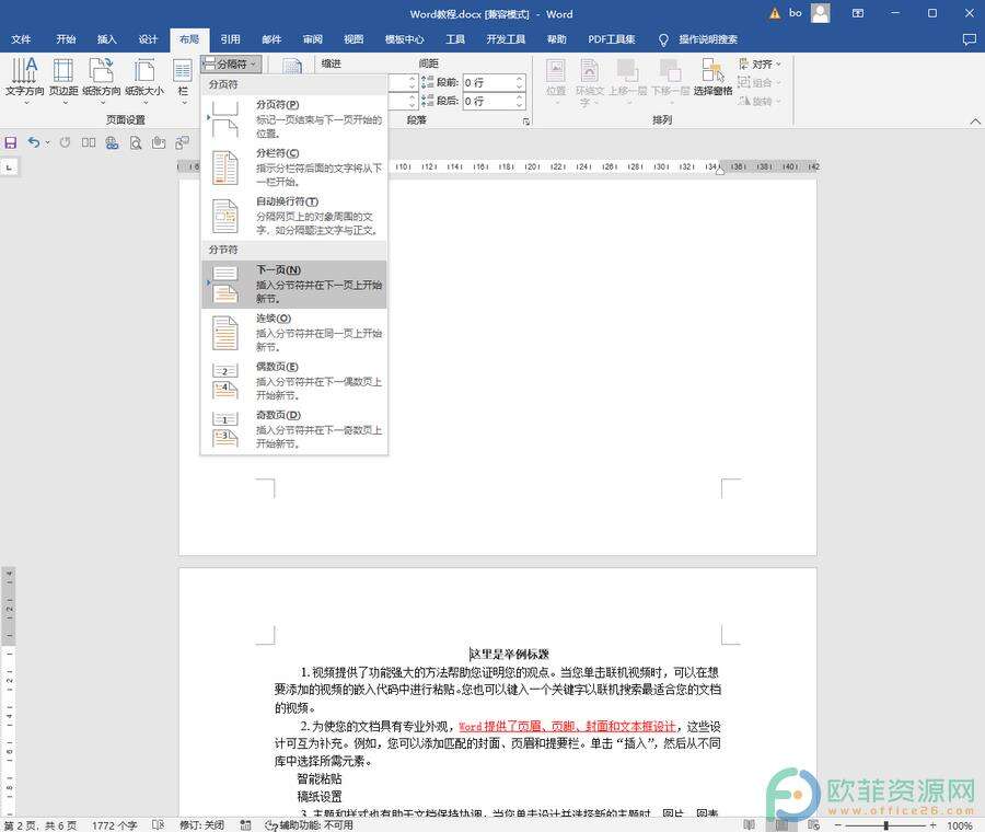 第一步:打开Word文档,点击定位到第二页的开头位置,接着点击“布局”选项卡中的“分隔符”按钮并在其子选项中点击“下一页”;