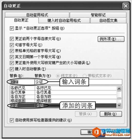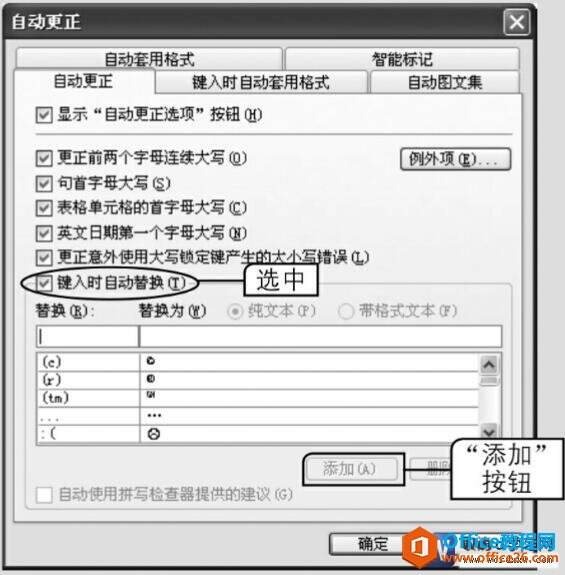 在“自动更正”选项卡中选中“键入时自动替换”复选框,才能启用自动更正功能,其他几个复选框的作用如下。