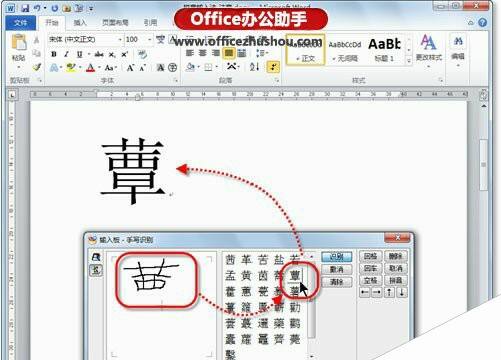 1、在Word 2010文档中,将任务栏中的输入法更改为“微软拼音”,开启微软拼音输入板,并切换到“手写识别”视图中。在输入板中使用鼠标手写生僻字,随着您的书写,系统将自动识别字符,并将与其相似的字符显示出来,您只需从中选择单击需要的字符,即可将其快速地插入到文档中。