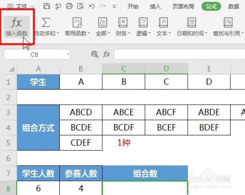 2、其次点击“公式-数学和三角函数”表中选中COMBIN