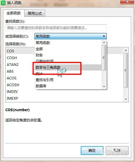 三、其次点击选择类别“数学与三角函数”