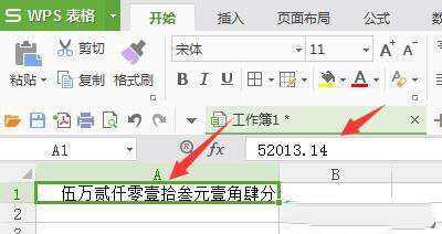 完成以上两个步骤之后,原先输入的小写数字金额 52013.14 已经自动变成了伍万贰仟零壹拾叁元壹角肆分,具体效果见下图: