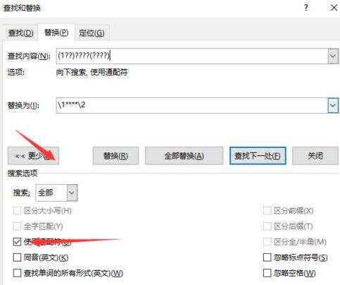 4、点击更多,在使用通配符前勾上,一定要勾上,不然此方法行不通。