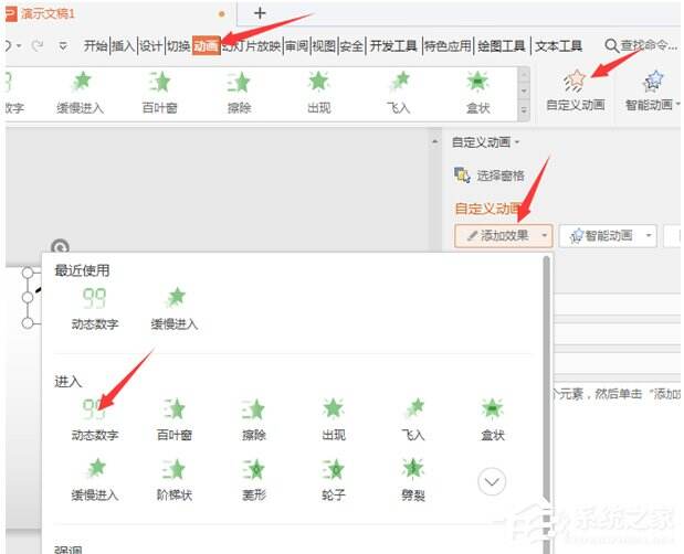 2、点击【动画】,选择【自定义动画】,在【添加效果】里面选择【动态数字】。