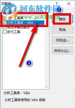 4.然后在转到的窗口“加载宏”中找到“分析工具库”和“分析工具库-VBA”,点击前面的方框进行勾选,然后点击“确定”按钮。