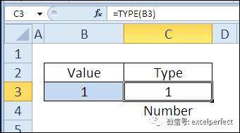 然而,如果在数值前面有一个撇号,那么TYPE函数结果是2 — 文本。