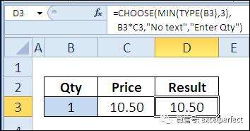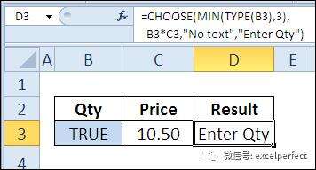 如果在B3中输入文本,TYPE函数返回2,因此CHOOSE函数返回消息“No text”。