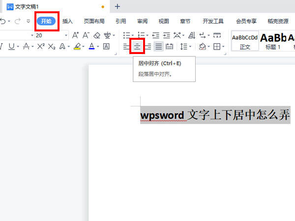 2、点击上方的【开始】,点击【居中对齐】图标即可。