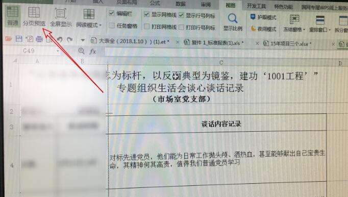 点击分页预览后,就可以看到当前这个wps表格在几页上,同时页面多出了几根蓝线