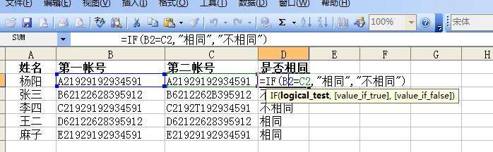 D2公式为:=IF(C2=B2,"相同","不同"),这样就可以实现excel两列对比,判断B2和C2是否相同,如果相同就返回值“相同”,反之则显示不同。