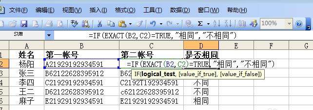 同样的操作比较其它人的数据。也许有朋友会问,B5和C5实质上有大小写区分的,因此使用这个公式不是完全准确。Excel中exact函数可以完全区分大小写,因此C2公式可改为:=IF(EXACT(A2,B2)=TRUE,"相同","不同"),然后下拉复制公式,完成excel两列数据对比。