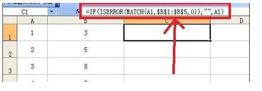C1输入公式:=IF(ISERROR(MATCH(A1,$B$1:$B$5,0)),"",A1)。Match部分得到的结果是#N/A或者数字,然后用ISERROR函数,将#N/A错误值进行处理,ISERROR(#N/A)得到TRUE,ISERROR(数字)得到false,最外面用IF函数来进行判断,如果第一参数是true,就执行第二参数,否则执行第三参数。这个应用是巧用excel两列对比,完成查找重复项。