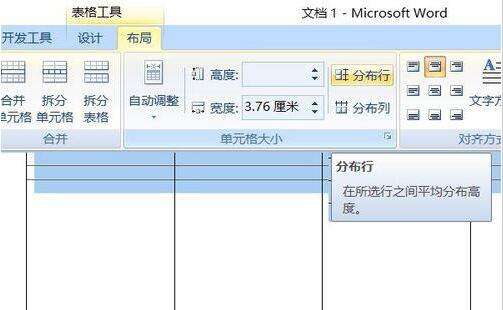 4、插入后的表格很小,将最后一行向下拉至底部,然后在表格工具——布局——单元格大小中选“分布行”。