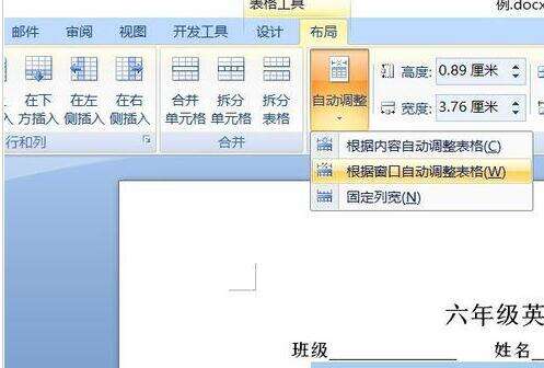 5、完成后的表格位置偏向右边,在布局中选择自动调整——根据窗口自动调整表格。将表格移至正中。
