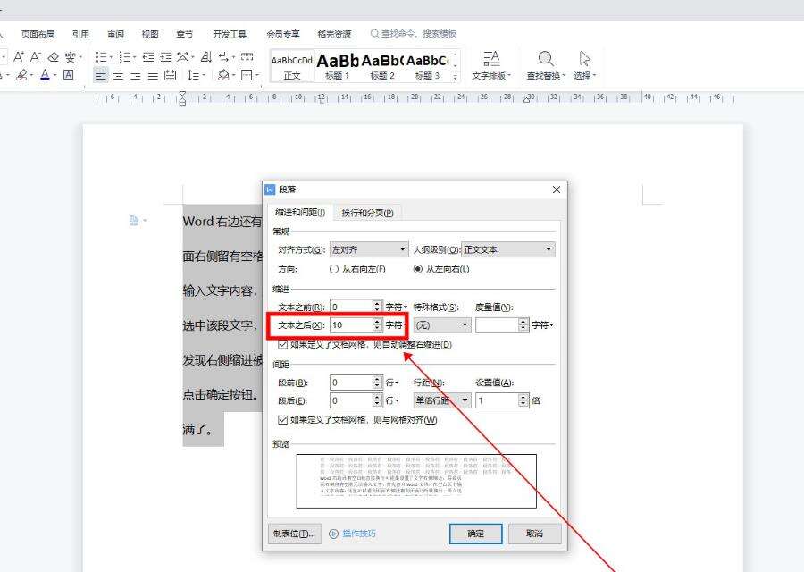 3、在段落对话框中,可以发现文本之后缩进被设置了字符数字。