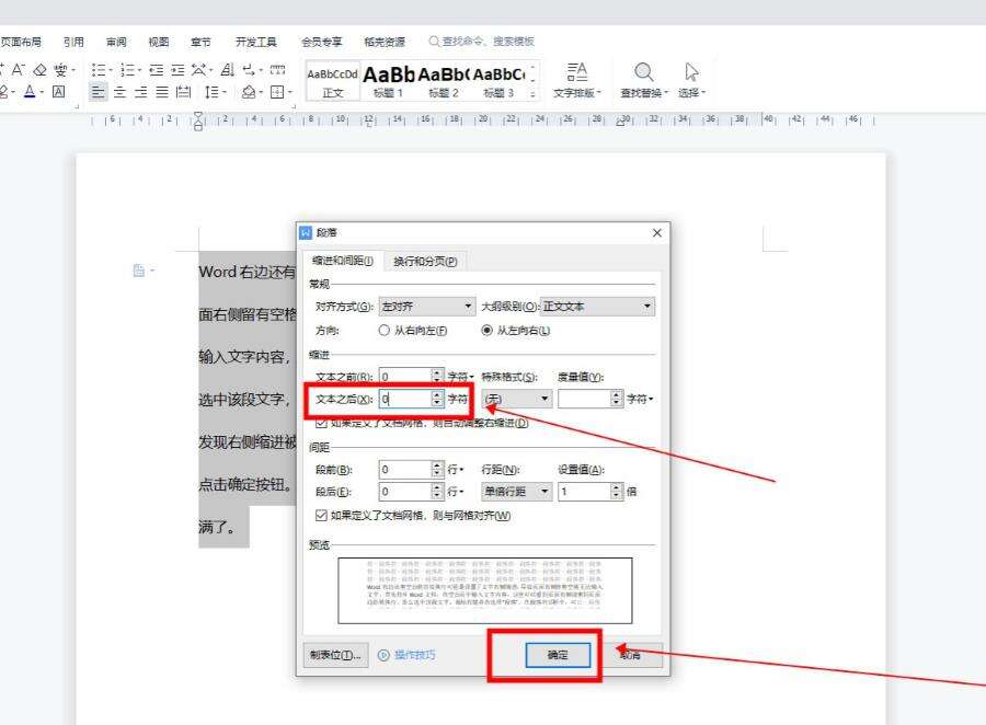 4、需要将右侧缩进字符设置为“0”,点击确定按钮。