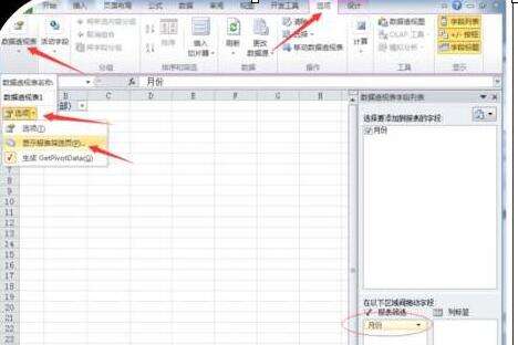 4、在弹出的数据透视表字段列表中,把月份(指定名称的表头)拖动到报表筛选中,单击选项卡->数据透视表名称选项->显示报表筛选页,弹出显示报表筛选页对话框,直接单击确定。