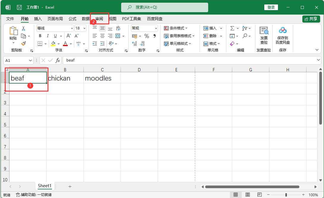 2、选择英文单词,点击审阅菜单。