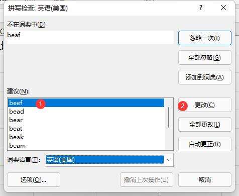 4、弹出拼写检查,选择正确的单词,点击更改。